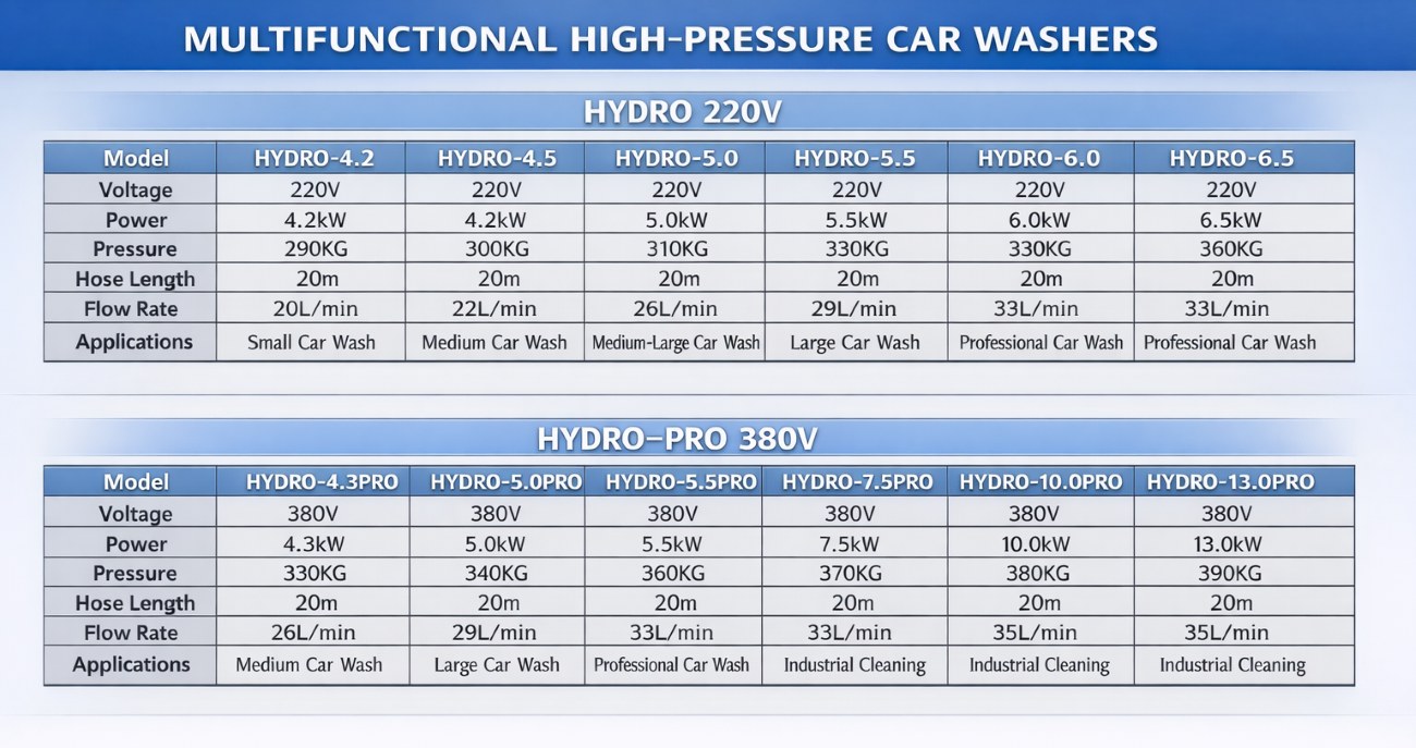 Работното налягане зависи от модела и конфигурацията, обикновено варира от 200 до 500 бара, подходящ както за търговско, така и за промишлено почистване.